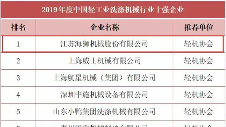 近日,中国轻工业联合会揭晓了2019年度中国轻工业百强、轻工业装备制造五十强、行业十强榜单,海狮机械荣登双榜单。五十强年度中国轻工业装备制造行业五十强榜单由中国轻工机械协会推荐的有22家企业荣登2019年度中国轻工业装备制造行业五十强榜单,海狮机械排名第13位。行业十强年度中国洗涤机械行业十强榜单由中国轻工机械
