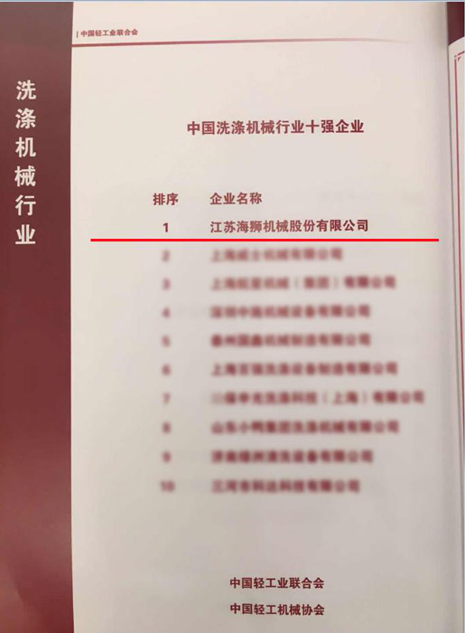 Today,Jiangsu Sea-lion Machinery Co.,Ltd has the honor to win The first place of China washing machinery industry top ten The eighth of Chinese light industrial equipment manufacturing industry top 30 enterprises The 23th of Chinese top 100 light industrial technology companies